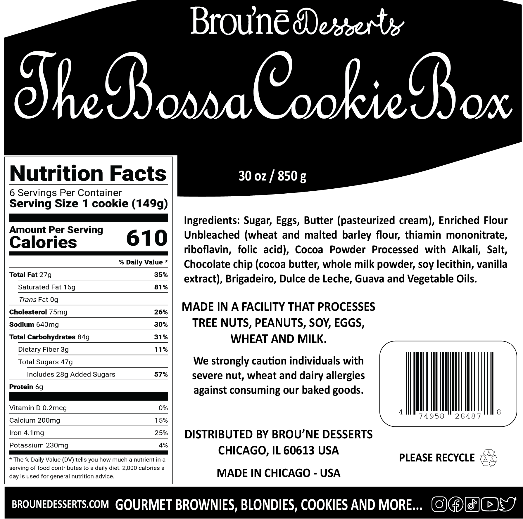 Introducing the Boss Box, a delightful of collection of cookies inspired by the vibrant flavors of Brazil! First up, Bruno. This cookie pays homage to the iconic Brazilian sweet treat with a rich and fudgy chocolate, brigadeiro. Next, we have the double chocolate cookie with doce de leite and sea salt. This cookie is the perfect combination of sweet and salty, with the luscious milk caramel flavor of doce de leite and a touch of sea salt to balance it out. Last, we have Romeo & Juliet cookie. This unique creation brings together the classic combination of guava, white chocolate and cheese, in this case we use goat cheese buttercream for a tangy twist that will delightfully surprise you. With the Bossa Box, you can savor the flavors of Brazil in every bite.